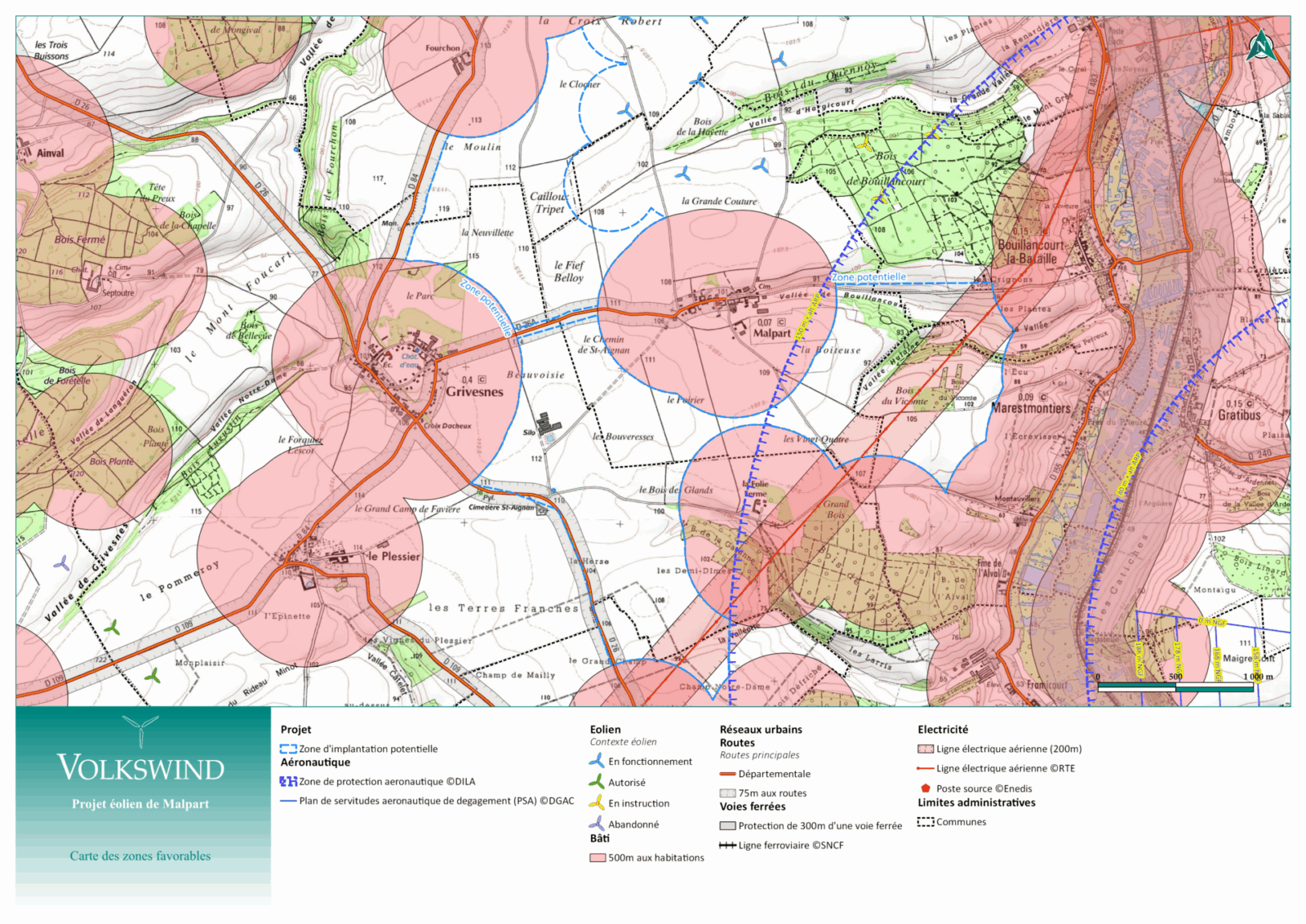 La réglementation impose un éloignement de 500 mètres des habitations, définissant ainsi une zone d’étude. Les études écologiques, paysagères et acoustiques réalisées depuis plus d’un an ont permis de conclure à la faisabilité d’un projet éolien sur la zone.